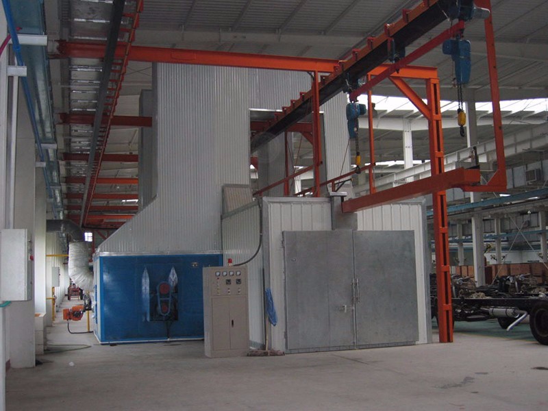 钢材预处理线专门处理6-200mm钢板,厚度0-300mm型钢,钢材预热处理后由进料输送系统送至封闭的抛丸清理室,利用抛丸器高速旋转的叶轮将钢丸(铸钢丸和钢丝切丸)加速抛打至工件表面,对工件进行冲击、刮削,以清除工件表面的铁锈、氧化皮和污物。利用刮扫装置高强度尼龙滚刷、收丸螺旋、高压吹风管将工件表面的积丸、积尘和浮尘吹扫干净。除锈后的钢材直接进入喷漆室,通过装在上下喷漆小车上的喷枪将车间保养底漆喷涂在工件表面上,然后进入烘干室烘干。使钢材表面漆膜达到指干状态后快速送出。