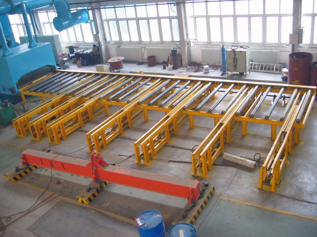 钢材预处理线专门处理6-200mm钢板,厚度0-300mm型钢,钢材预热处理后由进料输送系统送至封闭的抛丸清理室,利用抛丸器高速旋转的叶轮将钢丸(铸钢丸和钢丝切丸)加速抛打至工件表面,对工件进行冲击、刮削,以清除工件表面的铁锈、氧化皮和污物。利用刮扫装置高强度尼龙滚刷、收丸螺旋、高压吹风管将工件表面的积丸、积尘和浮尘吹扫干净。除锈后的钢材直接进入喷漆室,通过装在上下喷漆小车上的喷枪将车间保养底漆喷涂在工件表面上,然后进入烘干室烘干。使钢材表面漆膜达到指干状态后快速送出。