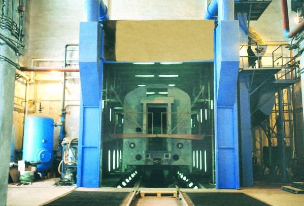钢材预处理线专门处理6-200mm钢板,厚度0-300mm型钢,钢材预热处理后由进料输送系统送至封闭的抛丸清理室,利用抛丸器高速旋转的叶轮将钢丸(铸钢丸和钢丝切丸)加速抛打至工件表面,对工件进行冲击、刮削,以清除工件表面的铁锈、氧化皮和污物。利用刮扫装置高强度尼龙滚刷、收丸螺旋、高压吹风管将工件表面的积丸、积尘和浮尘吹扫干净。除锈后的钢材直接进入喷漆室,通过装在上下喷漆小车上的喷枪将车间保养底漆喷涂在工件表面上,然后进入烘干室烘干。使钢材表面漆膜达到指干状态后快速送出。